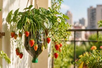 Cultivo de morangos em garrafa PET oferece solução para pequenos espaços