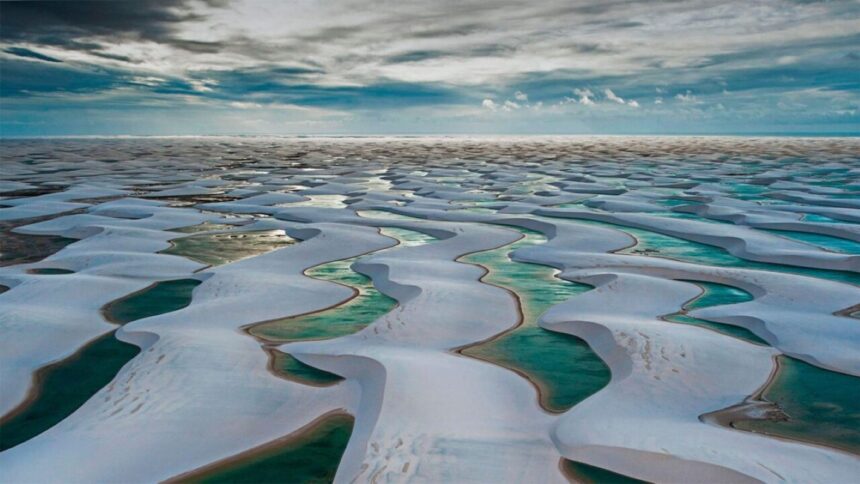 Esqueça tudo o que você já viu — ou imaginou — sobre desertos. No litoral do Maranhão, o Parque Nacional dos Lençóis Maranhenses desafia qualquer ideia comum de aridez. Lá, imensos montes de areia branca são cortados por lagoas temporárias de águas azul-turquesa, cristalinas e profundas. Sim, esse lugar existe — e está no Brasil.