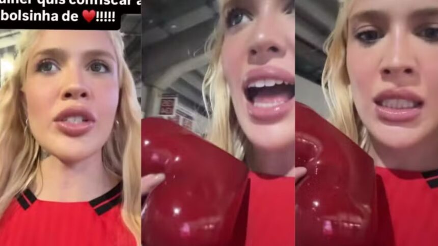 Conhecida por sua irreverência nas redes sociais, a modelo e influenciadora quase teve sua famosa “bolsinha da sorte” confiscada pela equipe de segurança do local. O acessório, em formato de coração, é considerado um amuleto entre os torcedores rubro-negros, e Karoline não abriu mão de mantê-lo consigo.
