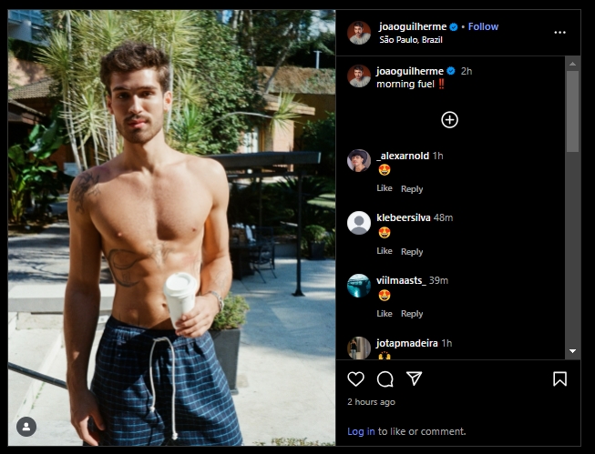 João Guilherme, de 23 anos, chamou atenção nesta sexta-feira (5) ao publicar uma foto sem camisa em São Paulo. O ator, filho do cantor Leonardo, apareceu segurando um copo de café e escreveu na legenda: “Combustível matinal!!”.